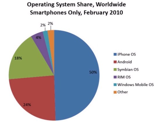 AdMob將移動(dòng)設(shè)備分為三個(gè)分類,分別是智能手機(jī)、功能手機(jī)(featurephone)和移動(dòng)上網(wǎng)設(shè)備。該報(bào)告指出,今年2月份,在智能手機(jī)上網(wǎng)流量統(tǒng)計(jì)中,iPhone操作系統(tǒng)占據(jù)了半壁江山,較去年同期的33%有大幅提升。增長(zhǎng)最快的操作系統(tǒng)是谷歌Android,所占份額從去年同期的2%猛增至24%。Symbian則節(jié)節(jié)敗退,去年2月份該操作系統(tǒng)在智能手機(jī)上網(wǎng)流量中的份額為43%,但上月卻銳減至18%。