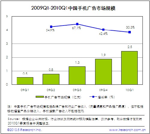2010Q1中國手機廣告市場規(guī)模達到2.5億,環(huán)比增長30.3%.受季節(jié)性因素影響,手機廣告市場增速放緩,但是保持增長發(fā)展態(tài)勢。本季度,新聞、體育、數(shù)碼、女性和汽車類手機廣告市場表現(xiàn)良好,文本、橫幅、全屏以及客戶端軟件等手機廣告形式受到廣告主青睞。針對不同受眾群體進行多重定向廣告營銷成為更多手機廣告服務提供商的實踐方向。盡管本季度手機廣告市場取得良好的市場表現(xiàn)力,但是廣告定價和廣告效果評估等制約手機廣告市場發(fā)展的關鍵因素仍將長期存在。