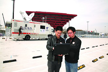 中國(guó)電信的應(yīng)急衛(wèi)星通信車(chē)抵達(dá)中國(guó)館,為世博會(huì)開(kāi)幕護(hù)航。