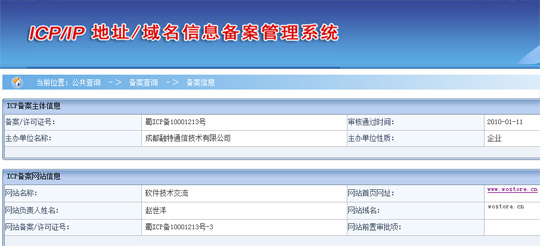 從目前看,WoStore相關(guān)域名可能同樣無法幸免,盡管目前wostore.cn已被用作中國聯(lián)通“WoStore應(yīng)用商店”官網(wǎng)域名,并在版權(quán)區(qū)標注為“中國聯(lián)通版權(quán)所有”,但目前域名注冊商處信息仍然顯示,wostore.cn所有者為“成都融特通信技術(shù)有限公司”。工信部備案資料顯示, wostore.cn于今年1月11日通過審核備案,目前網(wǎng)站負責(zé)人同樣是成都融特通信技術(shù)有限公司。