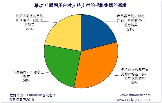 據(jù)Enfodesk易觀智庫(kù)最新報(bào)告《中國(guó)移動(dòng)互聯(lián)網(wǎng)市場(chǎng)用戶(hù)研究報(bào)告2010》研究發(fā)現(xiàn),目前在移動(dòng)互聯(lián)網(wǎng)用戶(hù)中,有75%的用戶(hù)對(duì)具有移動(dòng)支付功能的手機(jī)表現(xiàn)出明顯的興趣,其中影響不大,完全靠性?xún)r(jià)比決定是否購(gòu)買(mǎi)的用戶(hù)占比最多,約為32%,只有在移動(dòng)具備支付功能的手機(jī)和可接受價(jià)格相近時(shí)才會(huì)購(gòu)買(mǎi)。另外21%的人由于對(duì)移動(dòng)支付業(yè)務(wù)需求程度較高,愿意為此付出更高價(jià)格,其他22%的用戶(hù)則在比同性能手機(jī)價(jià)格低些之后,才會(huì)進(jìn)行消費(fèi)。除此之外,還有25%的用戶(hù)對(duì)于具備支付功能的手機(jī)沒(méi)有絲毫興趣,不愿意購(gòu)買(mǎi)。