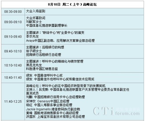 CTI論壇(ctiforum)8月3日消息(記者 潘婷婷):“第八屆中國呼叫中心產(chǎn)業(yè)高峰論壇暨第八屆中國最佳呼叫中心及最佳管理人頒獎(jiǎng)大會(huì)”定于2010年8月10日在上海國際貴都大飯店召開。此次大會(huì)是由中國信息化推進(jìn)聯(lián)盟客戶關(guān)系管理專業(yè)委員會(huì)主辦,ICMI國際客戶管理學(xué)院(中國區(qū))承辦。通過本次大會(huì),與會(huì)者將獲得中國最佳呼叫中心實(shí)踐經(jīng)驗(yàn)和最佳解決方案的分享,與業(yè)界精英共話呼叫中心和客戶關(guān)系管理的未來。