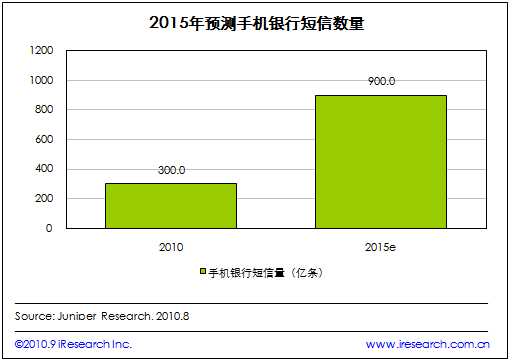 艾瑞咨詢根據(jù)Juniper Research發(fā)布的預(yù)測數(shù)據(jù)發(fā)現(xiàn),由于新類型的手機銀行短信提醒的應(yīng)用,到2015年,全球手機銀行短信量將達到900億條每年,相當(dāng)于每個手機銀行用戶每隔一天就會收到一條銀行發(fā)來的信息。