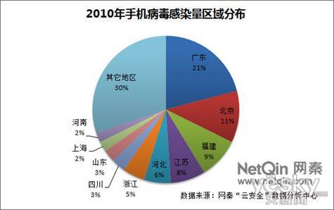 北京時間12月14日消息 近日,北京網(wǎng)秦天下科技有限公司(以下簡稱網(wǎng)秦)發(fā)布了《2010年中國大陸地區(qū)手機(jī)安全報告》[下載]。報告指出,據(jù)網(wǎng)秦“云安全”數(shù)據(jù)分析中心統(tǒng)計:截至2010年11月,新增手機(jī)病毒1513個,累積病毒數(shù)量達(dá)2357個。預(yù)計2010年手機(jī)病毒總數(shù)將超過2500種以上,同比增長193%,累計感染手機(jī)800萬部以上。其中,我國廣東地區(qū),以21%的感染比例位居首位,北京,上海,福建、江蘇等地位居其后。