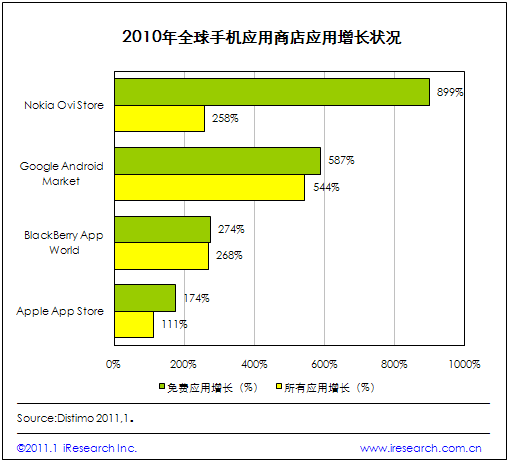 iResearch艾瑞咨詢整理Distimo最新公布數(shù)據(jù)發(fā)現(xiàn),2010年全球手機(jī)應(yīng)用商店免費(fèi)應(yīng)用大幅增長。數(shù)據(jù)表明,諾基亞Ovi Store免費(fèi)應(yīng)用增長速度最快,增長率為899%,谷歌Android Market和RIM的BlackBerry App World次之,增長率分別為587%和274%.