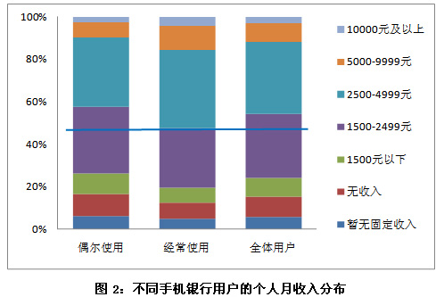 通過對不同手機(jī)銀行用戶的個(gè)人月收入分布可以看出,經(jīng)常使用手機(jī)銀行業(yè)務(wù)的用戶的個(gè)人月收入偏高,其中,個(gè)人月收入5000元以上的比例為15.4%,2500元以上的比例為52.2%,均高于偶爾使用手機(jī)銀行業(yè)務(wù)的用戶。事實(shí)上,經(jīng)常使用手機(jī)銀行業(yè)務(wù)的用戶由于收入偏高且手機(jī)銀行使用頻率高,必然成為手機(jī)銀行業(yè)務(wù)的核心客戶,這一較為富裕的目標(biāo)群體將在很大程度上促進(jìn)手機(jī)銀行業(yè)務(wù)的繁榮。