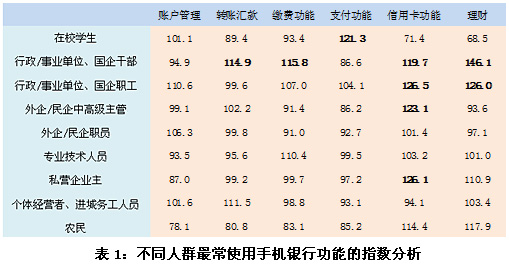 在本次調(diào)研中,對不同人群最常使用手機(jī)銀行功能的指數(shù)分析表明,在校學(xué)生更傾向于經(jīng)常使用手機(jī)銀行支付功能,較少使用手機(jī)理財(cái)功能;行政/事業(yè)單位、國企干部更傾向于使用手機(jī)銀行的轉(zhuǎn)賬匯款功能、繳費(fèi)功能、信用卡功能和理財(cái)功能,尤其是理財(cái)功能;行政/事業(yè)單位、國企職工經(jīng)常使用信用卡功能和理財(cái)功能的傾向性也非常明顯;外企/民企中高級主管則更傾向于經(jīng)常使用信用卡功能;私營企業(yè)主經(jīng)常使用手機(jī)銀行信用卡功能的傾向性顯著。