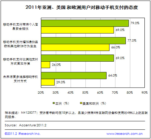 iResearch艾瑞咨詢根據(jù)Accenture的研究調(diào)查數(shù)據(jù)發(fā)現(xiàn),移動手機支付安全問題受到全球用戶的普遍關心。根據(jù)2011年Accenture對亞洲、美國以及歐洲125077位手機用戶進行的網(wǎng)上調(diào)查顯示,亞洲79%的受訪者擔心移動手機支付帶來的個人信息安全隱患,77%的受訪者擔心身份盜竊和其他欺詐行為的發(fā)生;美國和歐洲擔心以上安全問題的用戶也分別占到69%和66%。
