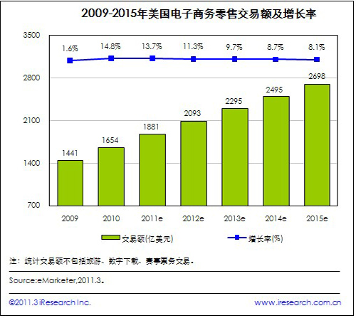 iResearch艾瑞咨詢(xún)根據(jù)美國(guó)商務(wù)部公布的數(shù)據(jù)發(fā)現(xiàn),2010年美國(guó)電子商務(wù)零售市場(chǎng)實(shí)現(xiàn)金融危機(jī)以來(lái)的首次強(qiáng)勁復(fù)蘇,其銷(xiāo)售額達(dá)1654億美元,較2009年同比增長(zhǎng)14.8%。同時(shí),根據(jù)eMarketer的美國(guó)電子商務(wù)零售預(yù)測(cè)模型獲得的數(shù)據(jù)顯示,2011年美國(guó)電子商務(wù)零售交易額將達(dá)到1881億美元。隨著電子商務(wù)的不斷成熟,一直到2015年期間美國(guó)電子商務(wù)零售交易額將保持穩(wěn)定健康的增長(zhǎng),且增長(zhǎng)率趨于持續(xù)小幅降低。