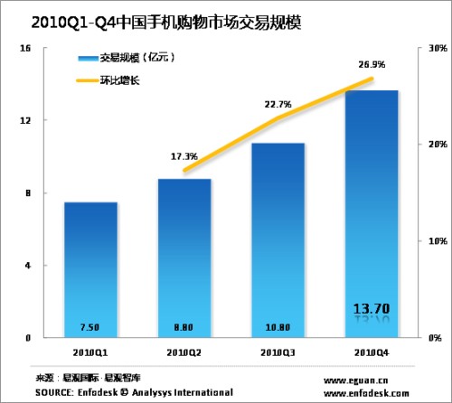 根據(jù)易觀智庫Enfodesk發(fā)布的《2010年第4季度中國手機購物市場季度監(jiān)測》數(shù)據(jù)顯示,2010年中國手機購物市場交易規(guī)模達到41億元。其中虛擬類商品交易規(guī)模達12億,占總體交易規(guī)模比例為33.1%。
