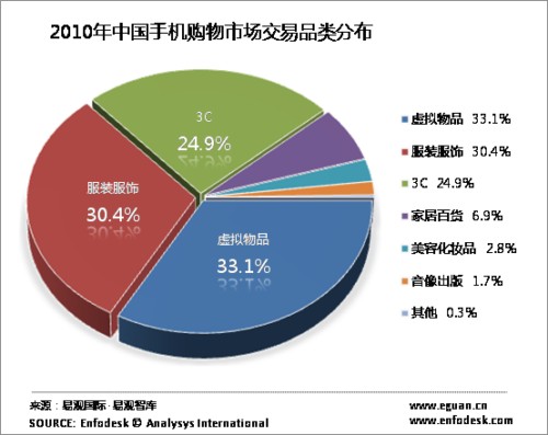 數(shù)據(jù)顯示2010年虛擬交易規(guī)模占比仍然居于交易品類的首位。虛擬交易包括手機充值、網(wǎng)游充值、網(wǎng)購彩票以及機票等業(yè)務。手機購物的發(fā)展周期特征呈現(xiàn)于PC端電子商務類似特征,不同的是手機端消費與服務的便捷性強相關(guān)。易觀研究認為,高標準化、便捷性消費是首先爆發(fā)的類目,如手機充值、彩票。未來此類交易仍然會是手機購物的主流。