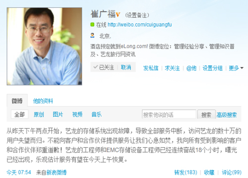 7月12日上午消息,因遭遇存儲(chǔ)故障,從昨日下午2時(shí)起,提供在線服務(wù)的旅游網(wǎng)站藝龍開始無法訪問,截至目前已經(jīng)過去了20個(gè)小時(shí)。藝龍CEO崔廣福通過新浪微博表示,藝龍工程師和EMC存儲(chǔ)工程師正在緊張搶修中,預(yù)計(jì)今天上午能夠恢復(fù)正常。新浪科技