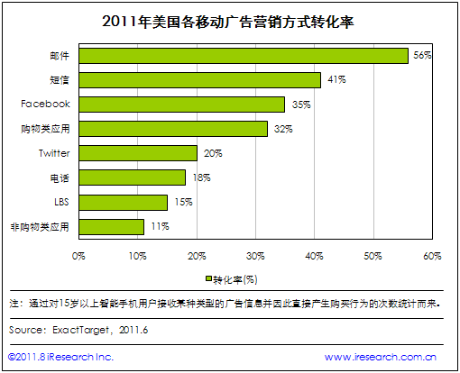 iResearch艾瑞咨詢整理ExactTarget調(diào)研數(shù)據(jù)時(shí)發(fā)現(xiàn):2011年在驅(qū)動(dòng)美國(guó)手機(jī)用戶產(chǎn)生購(gòu)買(mǎi)的移動(dòng)廣告營(yíng)銷方式中,電子郵件營(yíng)銷的轉(zhuǎn)化率最高,達(dá)到56%,短信、Facebook、購(gòu)物類手機(jī)應(yīng)用(如Amazon、eBay、Groupon)以41%、35%、32%的轉(zhuǎn)化率依次位居二、三、四位。