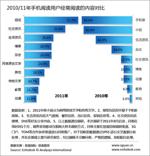 對(duì)比2011年與2010年手機(jī)閱讀用戶經(jīng)常閱讀內(nèi)容分類(lèi)的調(diào)查顯示, 用戶經(jīng)常閱讀的內(nèi)容中,文學(xué)作品占比從56%降至39.5%,而社交資訊、博客、雜志類(lèi)內(nèi)容占比上升,2010年社交資訊、博客、雜志類(lèi)占比分別為13%、10%、24%,相應(yīng)的2011年占比分別為28.4%、26.5%、26.4%。