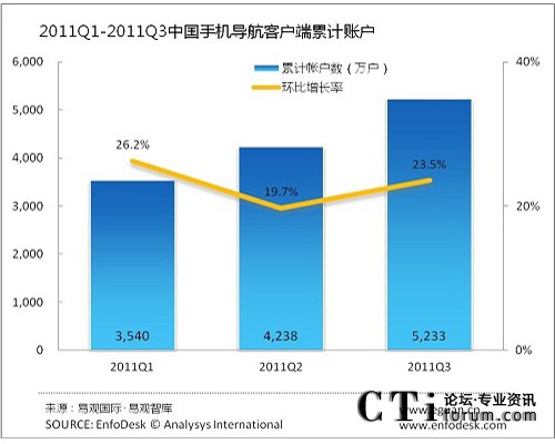 2011年3季度中國(guó)手機(jī)導(dǎo)航客戶端帳戶達(dá)5233萬(wàn)