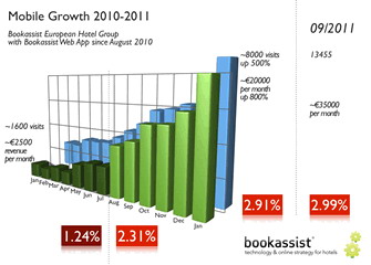 圖表1顯示了一座歐洲小城的一家城市酒店集團(tuán)自2010年以來(lái)的移動(dòng)業(yè)務(wù)發(fā)展趨勢(shì)。這家酒店集團(tuán)到2010年底才推出移動(dòng)優(yōu)化的網(wǎng)站,但從2010年8月份起采用了我們的移動(dòng)解決方案。