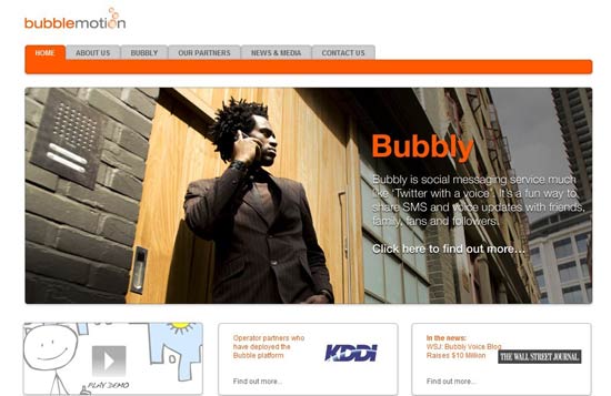 “Bubble Motion”的Bubbly平臺(tái)是一個(gè)手機(jī)端的語(yǔ)音微博服務(wù),允許用戶(hù)通過(guò)聲音向他們的關(guān)注者和粉絲發(fā)布狀態(tài)信息,模式與Twitter一樣,只是將文字變成了聲音,微博變成了bubbles,用戶(hù)將錄制的聲音更新到手機(jī),然后所有粉絲將收到一條短信通知,點(diǎn)擊短信內(nèi)的鏈接就可以收聽(tīng)。