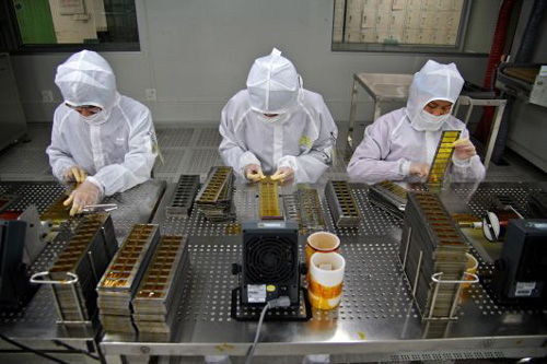 在專門的無塵區(qū)中,工人需要穿著防靜電服。在照片中,3名工人正在組裝iPad的攝像頭模組。