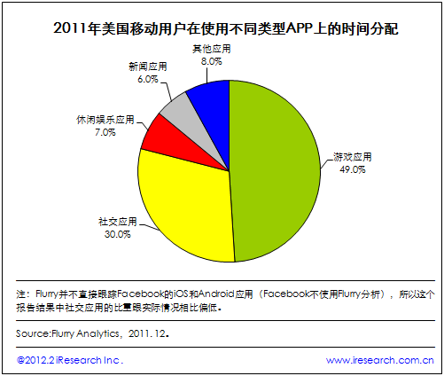 iResearch艾瑞咨詢整理Flurry最新的研究數(shù)據(jù)發(fā)現(xiàn),2011年美國(guó)移動(dòng)用戶花在游戲應(yīng)用上的時(shí)間最長(zhǎng),游戲應(yīng)用占據(jù)美國(guó)移動(dòng)用戶應(yīng)用使用總時(shí)間的49.0%,其次是社交網(wǎng)絡(luò)應(yīng)用,占30.0%,休閑娛樂應(yīng)用和新聞?lì)悜?yīng)用分別為7.0%和6.0%,剩下的其他類型應(yīng)用占據(jù)8.0%。