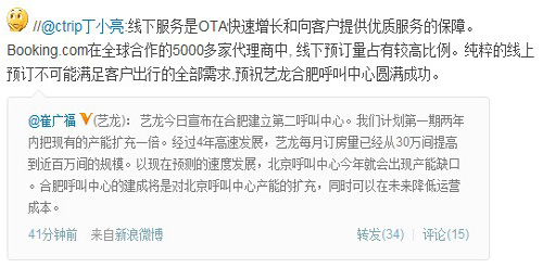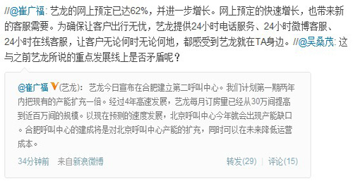 崔廣福在微博上說:“藝龍的網上預定已達62%,并進一步增長。網上預定的快速增長,也帶來新的客服需要。為確保讓客戶出行無憂,藝龍?zhí)峁?4小時電話服務、24小時微博客服、24小時在線客服,讓客戶無論何時無論何地,都感受到藝龍就在TA身邊!