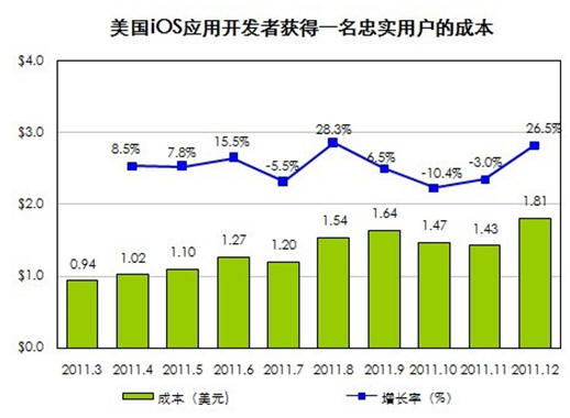 國(guó)際著名APP市場(chǎng)營(yíng)銷組織Fiksu最新的研究數(shù)據(jù)或許能出答案。2011年12月iOS應(yīng)用開(kāi)發(fā)者獲得一名忠實(shí)用戶的成本達(dá)到1.81美元,創(chuàng)下歷史新高。而在2011年第一季度,獲得一名用戶的平均成本為0.94美元,一年間單個(gè)用戶成本翻了一倍。當(dāng)用戶對(duì)蘋(píng)果商店里花樣繁多的游戲開(kāi)始麻木,就需要借助有針對(duì)性的推廣策略和強(qiáng)大的執(zhí)行,讓產(chǎn)品脫穎而出。如今忠實(shí)用戶成本的提高,使得幾乎所有開(kāi)發(fā)者乃至小團(tuán)隊(duì)都畏懼前期的市場(chǎng)推廣,大中型開(kāi)發(fā)公司可利用自身的資源循環(huán)造血拉動(dòng)用戶,越是小的開(kāi)發(fā)團(tuán)隊(duì)成功的幾率就越渺茫,而被吞并的可能性則大增。