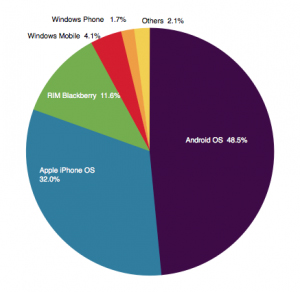 北京時(shí)間5月8日早間消息,市場(chǎng)調(diào)研公司尼爾森周一發(fā)布調(diào)查報(bào)告稱(chēng),美國(guó)市場(chǎng)智能機(jī)用戶量已經(jīng)超越基本功能手機(jī)用戶量。今年3月,智能機(jī)在美國(guó)手機(jī)市場(chǎng)的份額為50.4%,Android繼續(xù)占據(jù)統(tǒng)治地位,在智能機(jī)中的份額為48.5%。