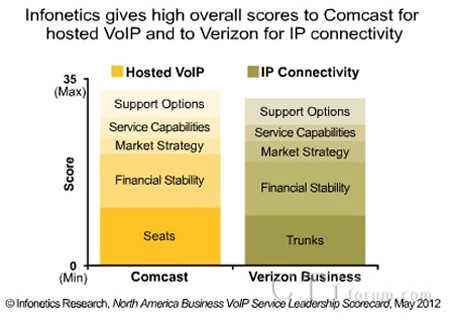 Infonetics Research公司VoIP 和IMS主要分析師Diane Myers 表示:“Comcast公司收購(gòu)了New Global Telecom,前者在我們企業(yè)VoIP平衡記分卡中常年領(lǐng)先,今年這個(gè)收購(gòu)?fù)苿?dòng)Comcast公司在Infonetics的托管業(yè)務(wù)VoIP領(lǐng)導(dǎo)力計(jì)分卡中位于第一的位置,連續(xù)四年的排名中,Verizon Business公司在IP 互聯(lián)領(lǐng)導(dǎo)力平衡計(jì)分卡中處于第一的位置,其次是AT&T公司”