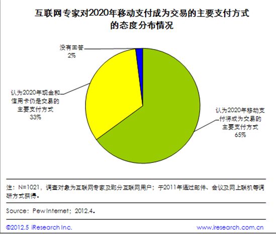 CTI論壇(ctiforum)6月13日消息(記者 楊佳林):據(jù)iResearch艾瑞咨詢整理Pew Internet調(diào)查數(shù)據(jù)發(fā)現(xiàn),多數(shù)互聯(lián)網(wǎng)專家認(rèn)為2020年移動支付將取代現(xiàn)金和信用卡成為主流支付方式。其中,65%的受訪專家認(rèn)為到2020年,大多數(shù)消費者將采用智能刷卡終端進行支付;然而33%的專家不贊成這種推測,他們認(rèn)為到2020年,現(xiàn)金和信用卡將仍然是主要的支付方式,消費者對NFC技術(shù)安全性的擔(dān)憂及主要貨幣電子轉(zhuǎn)換技術(shù)的限制會阻礙移動支付的進一步發(fā)展。