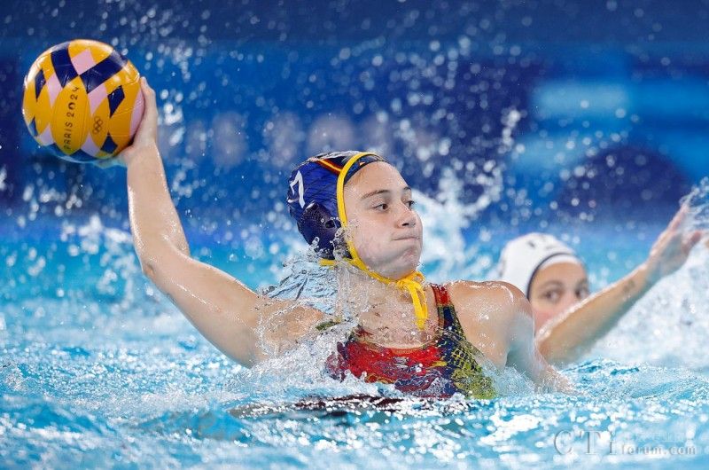 8月4日,西班牙隊(duì)球員埃萊娜(左)在比賽中。當(dāng)日,在巴黎奧運(yùn)會女子水球小組賽B組比賽中,西班牙隊(duì)13比11戰(zhàn)勝意大利隊(duì)。新華社記者 張玉薇 攝