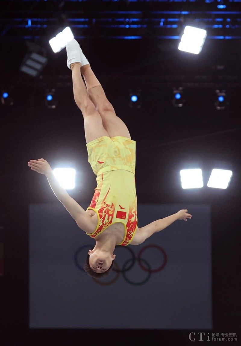 8月2日,中國選手王梓賽在比賽中。當(dāng)日,巴黎奧運(yùn)會蹦床項(xiàng)目男子預(yù)賽在貝爾西體育館舉行。新華社記者 曹燦 攝