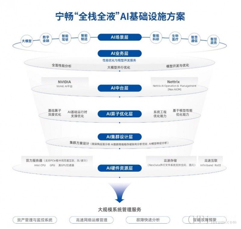 為此,寧暢構(gòu)建了以底層硬件到頂層應(yīng)用平臺(tái)的全棧AI系統(tǒng)環(huán)境。軟件層上以AI算子全棧優(yōu)化能力,為AI 業(yè)務(wù)提供并行加速、性能分析、模型開發(fā)優(yōu)化等服務(wù)支持,幫助用戶極速推進(jìn)AI應(yīng)用開發(fā)及管理;硬件層上實(shí)現(xiàn)GPU服務(wù)器與GPU卡的靈活組合,散熱方式上可選液冷、風(fēng)冷或風(fēng)液混合,實(shí)現(xiàn)性能與能效的絕佳平衡。寧暢近期推出的業(yè)內(nèi)首個(gè)實(shí)現(xiàn)原生全液冷的通用機(jī)架服務(wù)器,從原生全液冷、大解耦、高能效三方面發(fā)力,助力數(shù)據(jù)中心實(shí)現(xiàn)了“全棧全液”新生態(tài)。