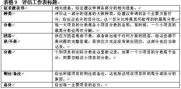 建議申請?jiān)u估工作表有助于資源選擇工作組客觀地對承包商建議進(jìn)行評價(jià)。這一過程包括在總分基礎(chǔ)上給各個(gè)方面評分。表格8舉出了一個(gè)具體的評分表表格9包含了對工作表標(biāo)題的解說。