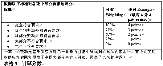 。。評分者應(yīng)該了解供應(yīng)方對所提建議申請的回復(fù),從各方面評估該建議符合每一評判標(biāo)準(zhǔn)的情況,相應(yīng)地給出分?jǐn)?shù)。根據(jù)每個(gè)標(biāo)準(zhǔn),應(yīng)在評判過程中分組給出最高分?jǐn)?shù)。表格9舉例說明了如何對回復(fù)打分。.