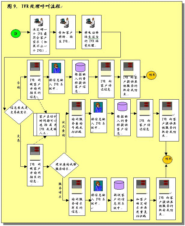 根據(jù)呼叫處理部分所作的說明,在完成初次聯(lián)絡(luò)過程之后,服務(wù)代表將確定呼叫者的需要。之后服務(wù)代表將協(xié)助呼叫者或者使其選擇IVR系統(tǒng),該系統(tǒng)通過自動為這些請求錄音提供相關(guān)的信息和服務(wù)。服務(wù)代表將接受培訓(xùn)識別哪些交易服務(wù)和信息服務(wù)可以通過IVR進行,這樣他們可以使呼叫者選擇自我服務(wù)。圖9圖示了用這一辦法處理呼叫的過程。