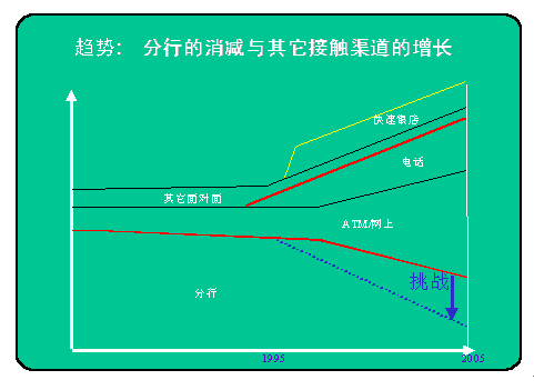 。。下圖為國外專家對銀行不同客戶服務(wù)渠道發(fā)展比例的說明?梢钥吹剑瑺I業(yè)廳的比例在逐年下降,而國外不少銀行甚至將進(jìn)一步壓縮營業(yè)廳比例作為一項(xiàng)渠道的任務(wù)。電話銀行也就是通過IVR實(shí)現(xiàn)的自助服務(wù),自然是呼叫中心的一部分,但人工服務(wù),包括對上網(wǎng)及其它互動方式的客戶提供的座席代表服務(wù),當(dāng)然更是現(xiàn)代呼叫中心業(yè)務(wù)的一部分,圖上雙紅線內(nèi)所表示的正是不斷發(fā)展的呼叫中心的所占比例。