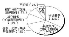 根據(jù)IT支出就可以推測(cè)購(gòu)買過(guò)程及其重點(diǎn)。平均而言,在被調(diào)查者的CRM支出中,29%用在硬件上,16%用在軟件上,38%用在內(nèi)部服務(wù)上,16%用在外部服務(wù)上。圖2顯示了用在外部服務(wù)上的IT支出,其中包括: