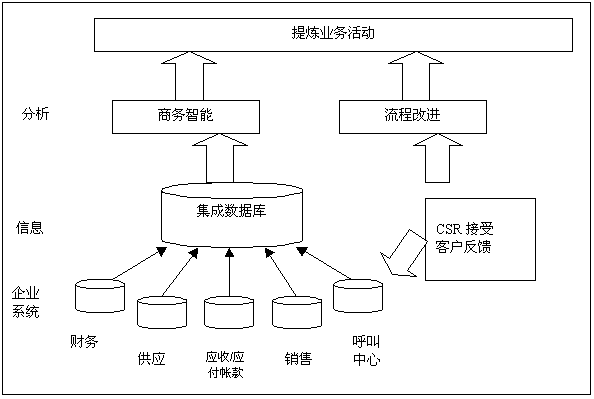 分析型CRM,也著稱為“后臺”或“戰(zhàn)術(shù)”CRM。用來分析理解發(fā)生在前臺的客戶活動。分析型CRM需要技術(shù)(編譯和處理大量的客戶數(shù)據(jù),以便于分析)和新的業(yè)務(wù)流程(提煉面向客戶的業(yè)務(wù),以提高忠誠度和利潤率)。在分析師和業(yè)界專家的推動下,如今大多數(shù)CRM供應(yīng)商,或者創(chuàng)造分析型CRM能力,或者與商務(wù)智能(BI)供應(yīng)商合伙,合作分析他們的數(shù)據(jù)。圖2表明了數(shù)據(jù)和流程如何用來提煉業(yè)務(wù)活動。