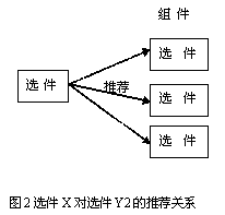 當(dāng)客戶選擇某個(gè)選件時(shí),系統(tǒng)自動(dòng)提示推薦另一選件,這種關(guān)系稱為選件的推薦關(guān)系。比如,在配置手機(jī)產(chǎn)品時(shí),選擇了某電話選件,則推薦使用特定充電器型號(hào)選件,雖然其他類似的選件也可以適用。如圖2所示,雖然選件X可以與組件Y內(nèi)的選件Y1,Y2,Y3搭配,但推薦使用Y2。