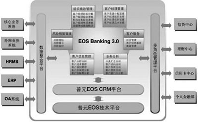 普元公司順應(yīng)中國銀行業(yè)發(fā)展的趨勢(shì),綜合國內(nèi)外金融業(yè)的市場(chǎng)營銷和管理模型,把具有世界級(jí)水平的EOS平臺(tái)推廣到銀行業(yè),提供具有中國特色的“EOS銀行客戶經(jīng)理管理系統(tǒng)”。這套系統(tǒng)可以幫助銀行快速組織資源,面向客戶提升客戶服務(wù)、市場(chǎng)營銷水平,同時(shí)對(duì)客戶經(jīng)理的業(yè)績考核加強(qiáng)管理,為客戶經(jīng)理提供風(fēng)險(xiǎn)控制工具,為營銷主管部門決策提供支持。最終實(shí)現(xiàn)幫助銀行達(dá)到提高利潤、降低成本,提高銀行客戶滿意度及提高市場(chǎng)占有率的管理目標(biāo)。