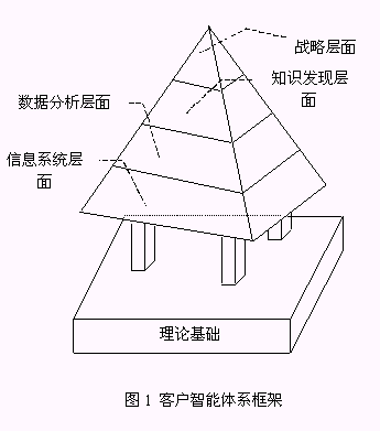 客戶智能系統(tǒng)(CI System)是本文提出的實現(xiàn)客戶智能的系統(tǒng)平臺。它包括了客戶智能體系中的信息系統(tǒng)層面、數(shù)據(jù)分析層面、知識發(fā)現(xiàn)層面,是基于客戶智能理論的可操作的系統(tǒng)框架。因此,客戶智能體系也可以簡單地用客戶智能基礎(chǔ)理論和基于客戶智能理論的客戶智能系統(tǒng)兩個邏輯層面表示(圖2);诳蛻糁悄艿腃RM系統(tǒng)是本文描述的客戶智能系統(tǒng)中的一種。