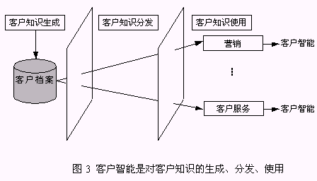 客戶知識是人們通過實踐認(rèn)識到的、與客戶有關(guān)的規(guī)律性,而客戶智能是獲得客戶知識并使用客戶知識求解問題的能力。客戶智能是對企業(yè)戰(zhàn)略決策真正有價值的事物和行動?蛻糁悄懿粌H包括了客戶知識的生成,而且更強調(diào)了客戶知識在企業(yè)中的分發(fā)、使用,直到產(chǎn)生客戶智能。所以,客戶智能是對客戶知識的生成、分發(fā)和使用(圖3)。