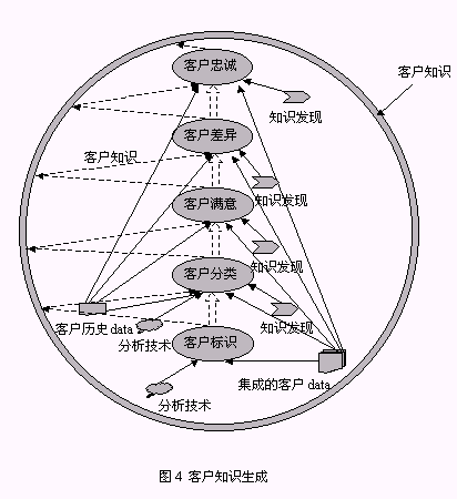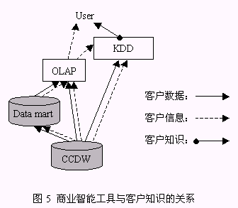 從以上構(gòu)成系統(tǒng)的三個組件的介紹中同時可以找到對以下兩個問題的答案:1、客戶數(shù)據(jù)、客戶信息、客戶知識之間的區(qū)別(圖5):由來自于事務(wù)系統(tǒng),如ERP、SFA等的源數(shù)據(jù)經(jīng)整理后放入CCDW或數(shù)據(jù)集市,這一過程處理的對象稱為客戶數(shù)據(jù);OLAP為決策人員提供了展示有意義的客戶數(shù)據(jù)的機制,這種有意義的客戶數(shù)據(jù)稱之為客戶信息;客戶數(shù)據(jù)和客戶信息均可以通過KDD技術(shù)的運用,提升為對決策有價值的客戶知識。2、客戶知識生成的途徑:從對第一個問題的解答中可以知道,客戶知識從KDD作用的對象來看有兩種途徑:KDD作用于客戶數(shù)據(jù)、KDD作用于客戶信息,總之,客戶知識生成是依賴于KDD過程的復(fù)雜的過程。