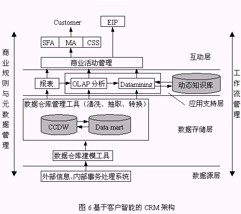 圖6是本文給出的以客戶智能為核心的I-CRM系統(tǒng)架構(gòu)。從數(shù)據(jù)源層來的客戶數(shù)據(jù)經(jīng)過ETL(抽取、轉(zhuǎn)換、裝載)、清洗后以數(shù)據(jù)存儲層的CCDW或數(shù)據(jù)集市的形式存儲。應(yīng)用支持層是提供了報表查詢、OLAP、知識發(fā)現(xiàn)分析決策工具,作用于客戶數(shù)據(jù),該過程產(chǎn)生的有價值的客戶知識存儲于動態(tài)知識庫中;訉犹峁┝薎-CRM利用客戶知識從而有效實施其功能的場所。該架構(gòu)具有以下特點:
