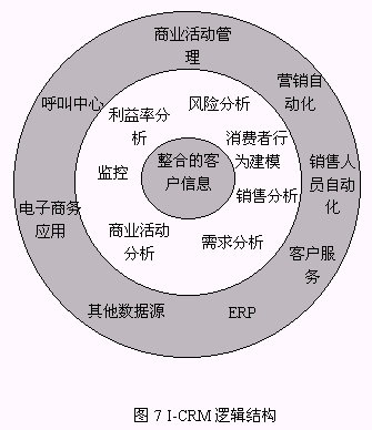 5) EIP(Enterprise Information Portal,企業(yè)信息門戶)提供了用戶獲取信息的統(tǒng)一界面(基于WEB)。通過這個界面,I-CRM將客戶知識分發(fā)在包括事務(wù)型系統(tǒng)在內(nèi)的所有企業(yè)應(yīng)用,使I-CRM成為企業(yè)應(yīng)用的核心并促進企業(yè)集成;