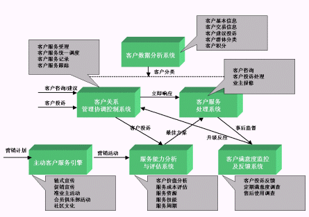 目的是保證和提高客戶服務的工作效率與質(zhì)量水平。例如,當客戶滿意度監(jiān)測與反饋系統(tǒng)將客戶信息反饋給協(xié)調(diào)控制系統(tǒng)后,后者立刻要求客戶盈利能力評估系統(tǒng)進行評估,并提出最佳方案,然后向客戶服務處理系統(tǒng)發(fā)出指令,由它進行實施。
