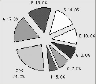 圖2 2003年中國××軟件市場品牌市場結(jié)構(gòu)(假設(shè))