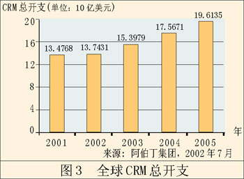 單單這還不是惟一能夠說明問題的。早在2002年,F(xiàn)orrester研究公司就聲稱,來自CRM的收入將從428億美元增長到738億美元。AMR研究公司同樣預測,這個領域會不斷增長。AMR的調查表明,91%的公司會在這方面增加開支,預計總開支會增長8%。值得一提的是,AMR所指的這一塊市場是“客戶管理”,而不是較為傳統(tǒng)的CRM,這說明CRM應用軟件的作用發(fā)生了轉變。