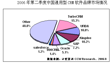 計(jì)世資訊(CCW Research)數(shù)據(jù)顯示,2006年二季度中國(guó)CRM軟件市場(chǎng)規(guī)模達(dá)2.25億元人民幣,比去年同期增長(zhǎng)20.1%,其中通用型CRM軟件市場(chǎng)規(guī)模為0.80億元,占總體CRM市場(chǎng)份額的35.5%。