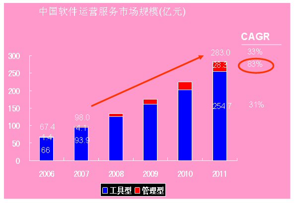 2006中國軟件運(yùn)營服務(wù)(SaaS)產(chǎn)業(yè)的規(guī)模為68億元,2011年將突破400億,達(dá)到406億元,未來五年的復(fù)合增長率達(dá)到43%。這是國內(nèi)ICT領(lǐng)域權(quán)威研究機(jī)構(gòu)計世資訊(CCW Research)在其最新發(fā)布的《軟件業(yè)的下一個十年——中國軟件運(yùn)營服務(wù)(SaaS)市場發(fā)展趨勢研究報告》中指出的。