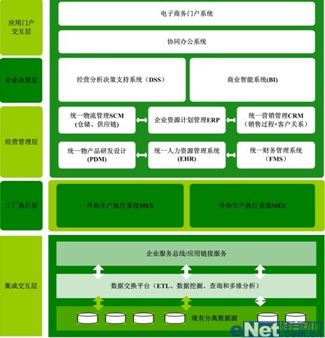 根據(jù)企業(yè)管理發(fā)展戰(zhàn)略及目標(biāo),需要考慮建設(shè)“集成化數(shù)字管控制造系統(tǒng)”,涵蓋企業(yè)決策層、企業(yè)經(jīng)營管理層。根據(jù)整體業(yè)務(wù)模式,企業(yè)經(jīng)營管理層又可以進(jìn)一步分解為公司管理層和工廠執(zhí)行層;從信息化戰(zhàn)略支撐角度可以分解為企業(yè)門戶交互層、應(yīng)用系統(tǒng)層、應(yīng)用集成層和網(wǎng)絡(luò)支撐層。實(shí)現(xiàn)企業(yè)信息流、資金流、物流、商物流的高度集成、統(tǒng)一,為企業(yè)生產(chǎn)、經(jīng)營提供強(qiáng)有力的信息化支撐。